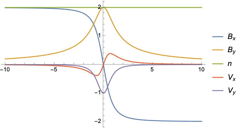 Here we set \(B_y(z=\infty) = 1/2 B_y(z=0)\) and \(B_0 = 2 B_z\), and fix \(λ_{z,∞} = -1\). By varying \(λ_{n,∞}\), we find that the magnetic field profiles are exactly the same, while plasma velocity profiles vary. We normalize the plasma velocity by asympotic Alfvén velocity \(v_{A,∞} = B_0 / \sqrt{n}\), and the profiles are plotted below Figure 1 (b). It could be seen that for \(λ_{n,∞} = 1\), we have zero bulk velocity change across the current sheet in the asymptotic limit.