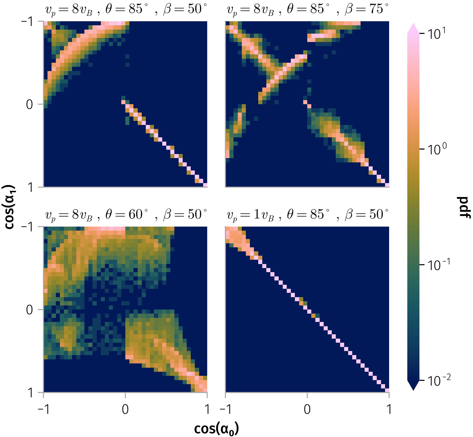 Figure 6 illustrates the transition matrix for 100 keV particles (velocity \(v_p \approx 4000\) km/s) under four magnetic field configurations: (i) \(v_0 = 500\) km/s, \(θ = 85°\), \(β = 50°\); (ii) \(v_0 = 500\) km/s, \(θ = 85°\), \(β = 75°\); (iii) \(v_0 = 500\) km/s, \(θ = 60°\), \(β = 50°\); and (iv) \(v_0 = 4000\) km/s, \(θ = 85°\), \(β = 50°\). Enhanced probability along the diagonal corresponds to weakly scattered particles (\(∆α = α_1 - α_0 = 0\)), while spreading around the diagonal reflects diffusive scattering. Large pitch-angle jumps are represented by non-diagonal elements.